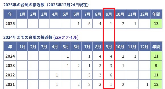 夏の天候で気になるのが台風です。過去の気象情報によると2025年までの台風接近数をみると、7月〜10月の間に台風の接近が集中しており、この影響で雨の中の引っ越しになってしまうことも考えられます。