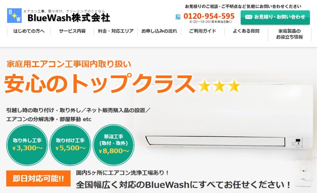 BlueWashはエアコンの分解洗浄を得意とする業者で、分解洗浄だけで年間56,000台の実績があります。取付け取り外しも1年の保証期間があるのに格安で、なおかつ即日対応もできるので急に決まった引越しでも、スムーズにエアコンを移設してもらえます。