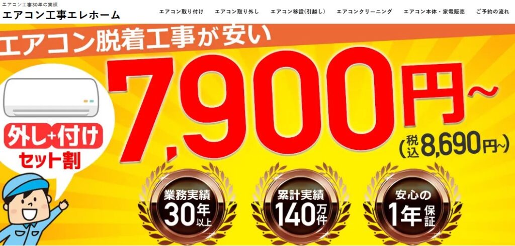 エレホームは大阪に本社のある工事業者ですが、日本全国に営業拠点や協力会社があり、北海道を除く全国でエアコンの取付け取り外しを行っています。20年以上の実績があり、エアコンだけでなく洗濯機、食洗機などの取付け、取り外しを行っています。