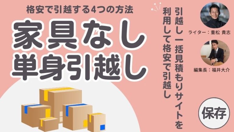 単身引越しの相場は通常期で約3.5万円、繁忙期は約5万円程度になります。移動距離や荷物の量にもよりますが、予算として4万〜6万円くらい考えておく必要があるのですが、家具なしとなると話が少し変わってきます。
