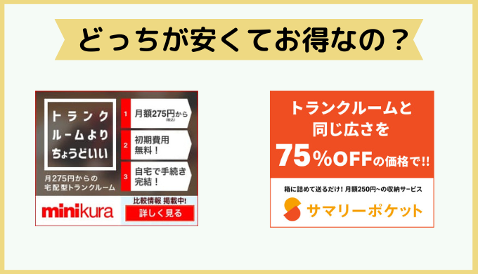 ミニクラで1年以上預けた場合には、ボックス単位の取り出し費用が無料になるため、長く預ける予定ならミニクラのほうがお得です。アイテム単位でもミニクラは一律880円で取り出せるので、こちらもやはりミニクラがおすすめです。